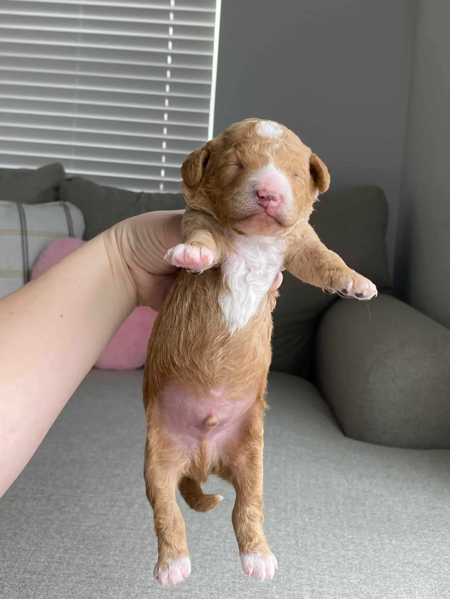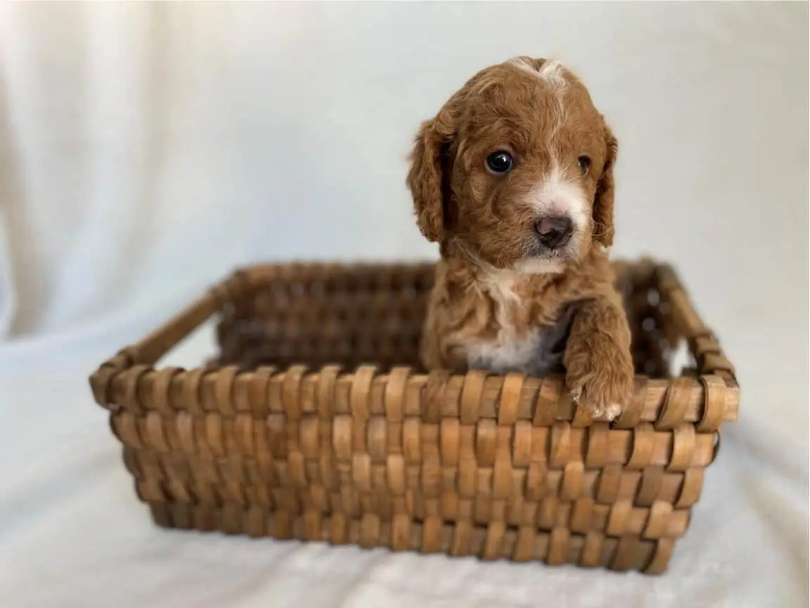 GOLDENDOODLE Petite – Meet Skunk from the Libby & Theo’s Petite Goldendoodle litter, Born Feb.23 2025. He should weigh approx. 10-15lbs.